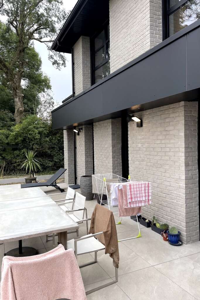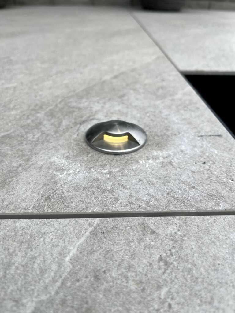 - Des spots encastrés Dis ont été intégrés dans le sol et dans les margelles pour illuminer la zone de terrasse sans créer d’éblouissement.