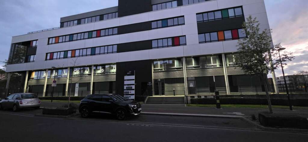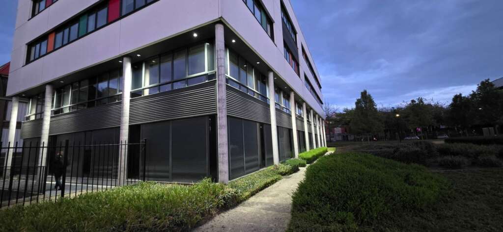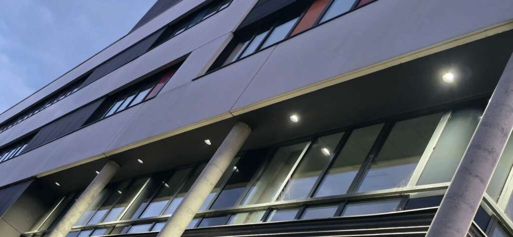 Le résultat est immédiatement visible dès la tombée de la nuit : la façade est désormais baignée d’une lumière homogène, nette et valorisante. Les colonnes en béton et les grandes baies vitrées du rez-de-chaussée sont mis en valeur, et le cheminement piétonnier tout autour du bâtiment retrouve sécurité et lisibilité.