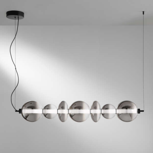 Avec ses 7 verres fumés et sa structure en métal noir, cette lampe à suspension apporte une touche d’originalité à votre intérieur. Son design épuré s’intègre parfaitement dans un univers contemporain, tout en créant un jeu de lumière subtil grâce à ses diffuseurs en verre.