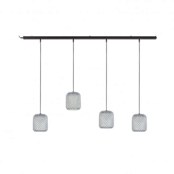 Ensemble suspension extérieure de 4 luminaires décoratifs suspendus à un rail conçu pour être installé en extérieur .