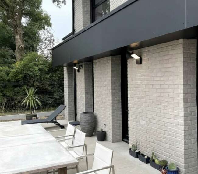 Réalisation d’un éclairage extérieur pour une maison individuelle avec des spots encastrés Dis de Beneito Faure pour sublimer la terrasse, et des appliques murales Neo XL (avec et sans détection) pour sécuriser les façades.